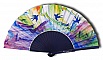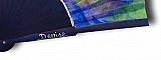 100 % satin et bois poirier peint en bleu. Chaque éventail est livré avec sa pochette. Chaque pièce est dessinée et peinte une par une.
