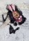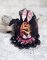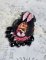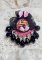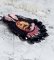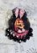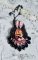 En haut du motif j’ai mis en forme une dentelle très fine à laquelle j’ai associé des fleurs boutons de roses sauvages en résine et une petite clochette Noire en verre.