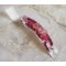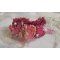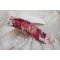 Les couleurs éclatantes présentent une forme généreuse et élégante avec les perles qui sont représentées dans ce bracelet. Il offre des courbes bombées avec les fleurs et les feuilles ainsi que les perles et les rocailles. D’une couleur bordeaux  et rose, elles évoquent la joie de vivre, la fête. Tout est recentré au centre afin de donner plus de douceur et d’originalité au motif.