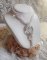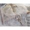 Roses blanches en résine, chatons crystal argentés, perles et poire nacrées ivoire, toupies, goutte en crystal de Swarovski, perles rondes shrink Miyuki blanches, coupelles légères filigranées, coquilles tulipes, anneaux en argent 925, rocailles et ruban organza blanc et beige.