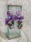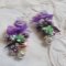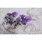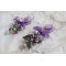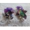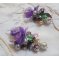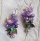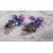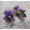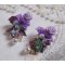 Perles diverses et Accessoires : Boules en métal argenté, Coupelle 5 fleurs et perles rondes filigranées en métal argentée, roses en résine violet/cream, feuilles paillette d’un violet brillant, fleurs rose/pèche mat et vert brillant (les feuilles et les fleurs sont en métal très léger), ruban organza violet, chaînettes d’extension à boule en argent 925.
